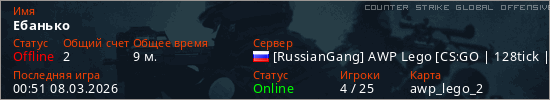 Играет на Counter Strike Global Offensive сервере. Страна: РоссияПервый раз замечен 00:30 08.03.2026