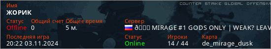Играет на Counter Strike Global Offensive сервере. Страна: РоссияПервый раз замечен 20:09 03.11.2024