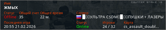 Играет на Counter Strike 1.6 сервере. Страна: РоссияПервый раз замечен 21:23 08.02.2026