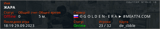 Играет на Counter Strike 1.6 сервере. Страна: РоссияПервый раз замечен 18:17 29.09.2023
