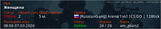 Играет на Counter Strike Global Offensive сервере. Страна: РоссияПервый раз замечен 08:00 07.03.2026