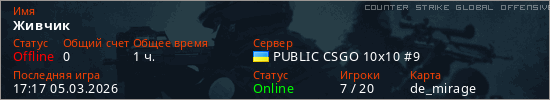 Играет на Counter Strike Global Offensive сервере. Страна: УкраинаПервый раз замечен 17:12 05.03.2026
