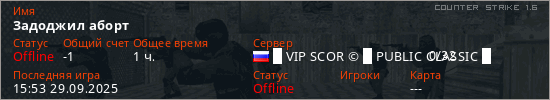 Играет на Counter Strike 1.6 сервере. Страна: РоссияПервый раз замечен 23:59 26.08.2025