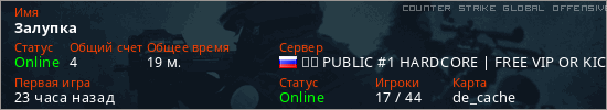 Играет на Counter Strike Global Offensive сервере. Страна: РоссияПервый раз замечен 20:49 19.03.2026