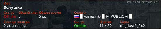 Играет на Counter Strike 1.6 сервере. Страна: РоссияПервый раз замечен 12:34 15.04.2026
