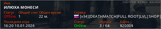 Играет на Counter Strike Source сервере. Страна: РоссияПервый раз замечен 03:35 20.12.2025