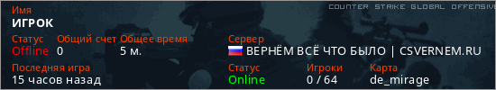Играет на Counter Strike Global Offensive сервере. Страна: РоссияПервый раз замечен 14:11 13.03.2026