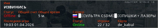 Играет на Counter Strike 1.6 сервере. Страна: РоссияПервый раз замечен 18:59 01.04.2026