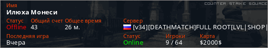 Играет на Counter Strike Source сервере. Страна: РоссияПервый раз замечен 21:02 16.01.2026