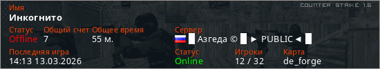 Играет на Counter Strike 1.6 сервере. Страна: РоссияПервый раз замечен 10:45 06.03.2026