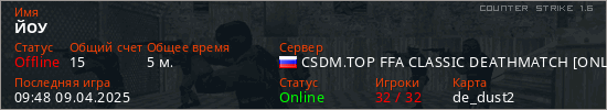 Играет на Counter Strike 1.6 сервере. Страна: РоссияПервый раз замечен 09:35 09.04.2025