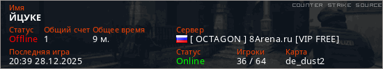 Играет на Counter Strike Source сервере. Страна: РоссияПервый раз замечен 06:17 24.12.2025