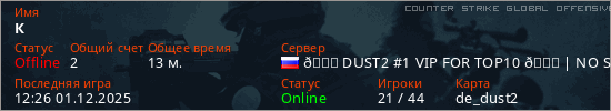 Играет на Counter Strike Global Offensive сервере. Страна: РоссияПервый раз замечен 08:20 24.11.2025