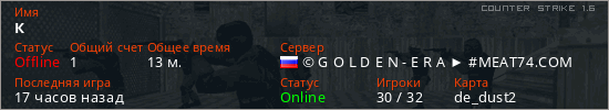 Играет на Counter Strike 1.6 сервере. Страна: РоссияПервый раз замечен 04:34 20.10.2025