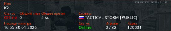 Играет на Counter Strike 1.6 сервере. Страна: РоссияПервый раз замечен 16:53 30.01.2026