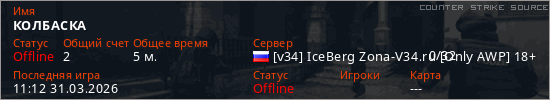 Играет на Counter Strike Source сервере. Страна: РоссияПервый раз замечен 11:08 31.03.2026