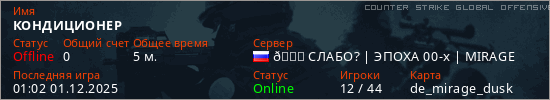 Играет на Counter Strike Global Offensive сервере. Страна: РоссияПервый раз замечен 00:54 01.12.2025