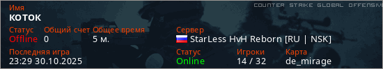 Играет на Counter Strike Global Offensive сервере. Страна: РоссияПервый раз замечен 22:54 30.10.2025