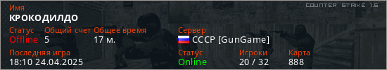 Играет на Counter Strike 1.6 сервере. Страна: РоссияПервый раз замечен 14:29 22.04.2025