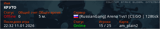 Играет на Counter Strike Global Offensive сервере. Страна: РоссияПервый раз замечен 22:19 11.01.2026
