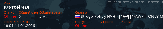 Играет на Counter Strike Global Offensive сервере. Страна: РоссияПервый раз замечен 09:59 11.01.2026