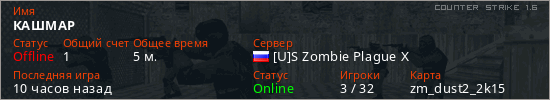 Играет на Counter Strike 1.6 сервере. Страна: РоссияПервый раз замечен 17:19 30.03.2026