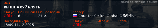 Играет на Counter Strike Source сервере. Страна: РоссияПервый раз замечен 20:29 13.11.2025