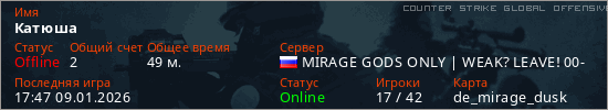 Играет на Counter Strike Global Offensive сервере. Страна: РоссияПервый раз замечен 13:18 09.05.2025