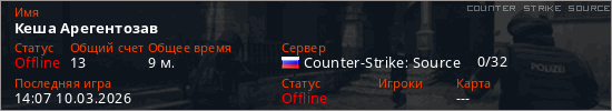 Играет на Counter Strike Source сервере. Страна: РоссияПервый раз замечен 13:49 10.03.2026