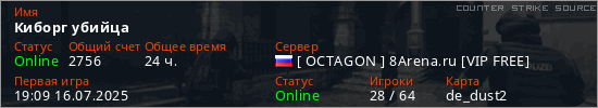Играет на Counter Strike Source сервере. Страна: РоссияПервый раз замечен 19:09 16.07.2025