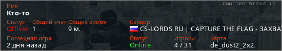 Играет на Counter Strike 1.6 сервере. Страна: РоссияПервый раз замечен 18:09 02.02.2026