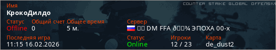 Играет на Counter Strike Global Offensive сервере. Страна: РоссияПервый раз замечен 11:02 16.02.2026