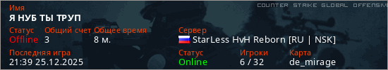 Играет на Counter Strike Global Offensive сервере. Страна: РоссияПервый раз замечен 20:50 25.12.2025