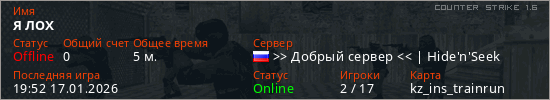Играет на Counter Strike 1.6 сервере. Страна: РоссияПервый раз замечен 19:12 17.01.2026