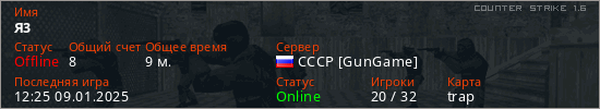 Играет на Counter Strike 1.6 сервере. Страна: РоссияПервый раз замечен 13:01 07.01.2025