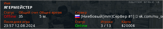 Играет на Counter Strike 1.6 сервере. Страна: РоссияПервый раз замечен 23:51 12.08.2024