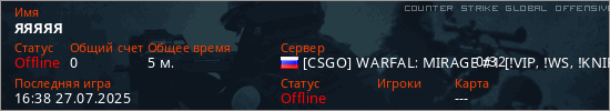 Играет на Counter Strike Global Offensive сервере. Страна: РоссияПервый раз замечен 16:16 27.07.2025