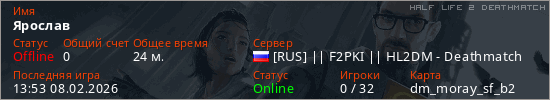 Играет на Half Life 2 DeathMatch сервере. Страна: РоссияПервый раз замечен 13:51 08.02.2026