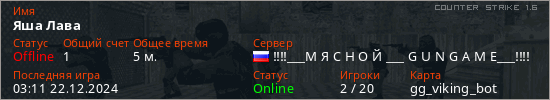 Играет на Counter Strike 1.6 сервере. Страна: РоссияПервый раз замечен 03:03 22.12.2024