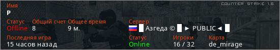 Играет на Counter Strike 1.6 сервере. Страна: РоссияПервый раз замечен 07:38 21.04.2026