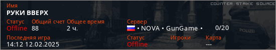 Играет на Counter Strike Source сервере. Страна: РоссияПервый раз замечен 12:59 26.01.2025