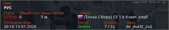 Играет на Counter Strike 1.6 сервере. Страна: РоссияПервый раз замечен 20:14 15.01.2026