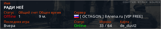 Играет на Counter Strike Source сервере. Страна: РоссияПервый раз замечен 10:28 24.03.2026