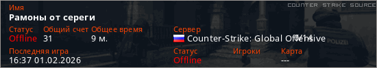 Играет на Counter Strike Source сервере. Страна: РоссияПервый раз замечен 19:35 09.11.2025