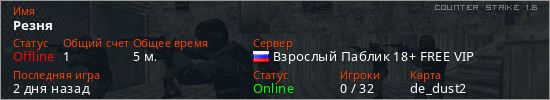 Играет на Counter Strike 1.6 сервере. Страна: РоссияПервый раз замечен 13:09 29.03.2026