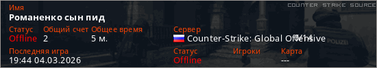 Играет на Counter Strike Source сервере. Страна: РоссияПервый раз замечен 19:14 04.03.2026
