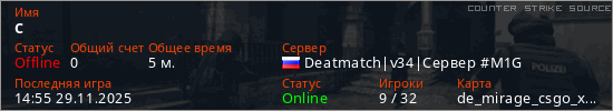 Играет на Counter Strike Source сервере. Страна: РоссияПервый раз замечен 14:53 29.11.2025