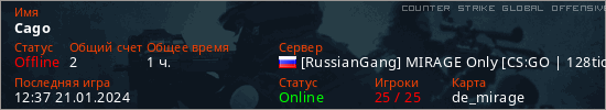 Играет на Counter Strike Global Offensive сервере. Страна: РоссияПервый раз замечен 13:48 04.01.2024