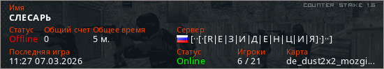 Играет на Counter Strike 1.6 сервере. Страна: РоссияПервый раз замечен 11:21 07.03.2026