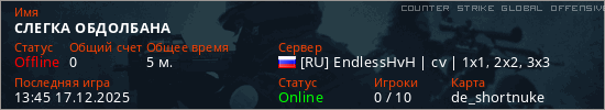 Играет на Counter Strike Global Offensive сервере. Страна: РоссияПервый раз замечен 12:57 17.12.2025
